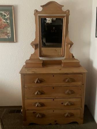 Full bed with box spring and mattress and matching dresser with mirror. Mattress is firm. Used as a guest bed. Pick up in Ellensburg near hospital. Dresser is 38” wide x 17” deep x 34” tall.