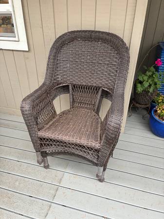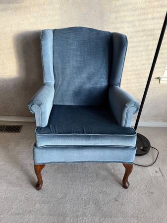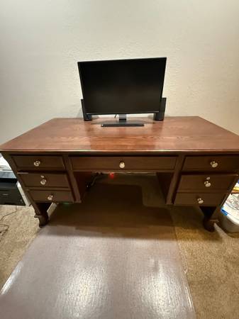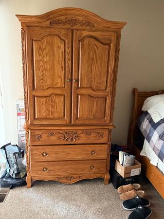 Entertainment center. $50 End table $15 Desk $75 Purple vinyl storage bench $25 Small secretary desk $35 Dining table with 6 chairs $150 Blue wing back chair $20 Sofa table $20 Oak armoire $100 4...
